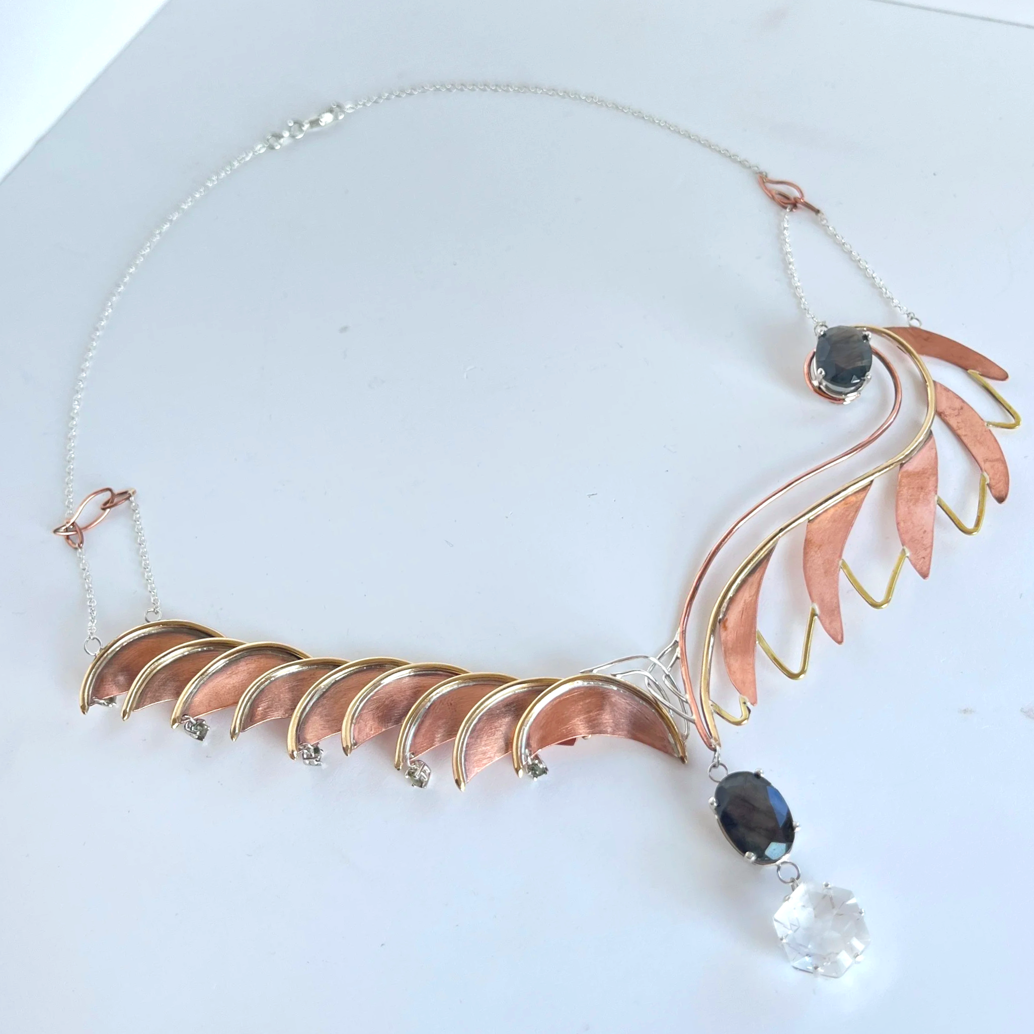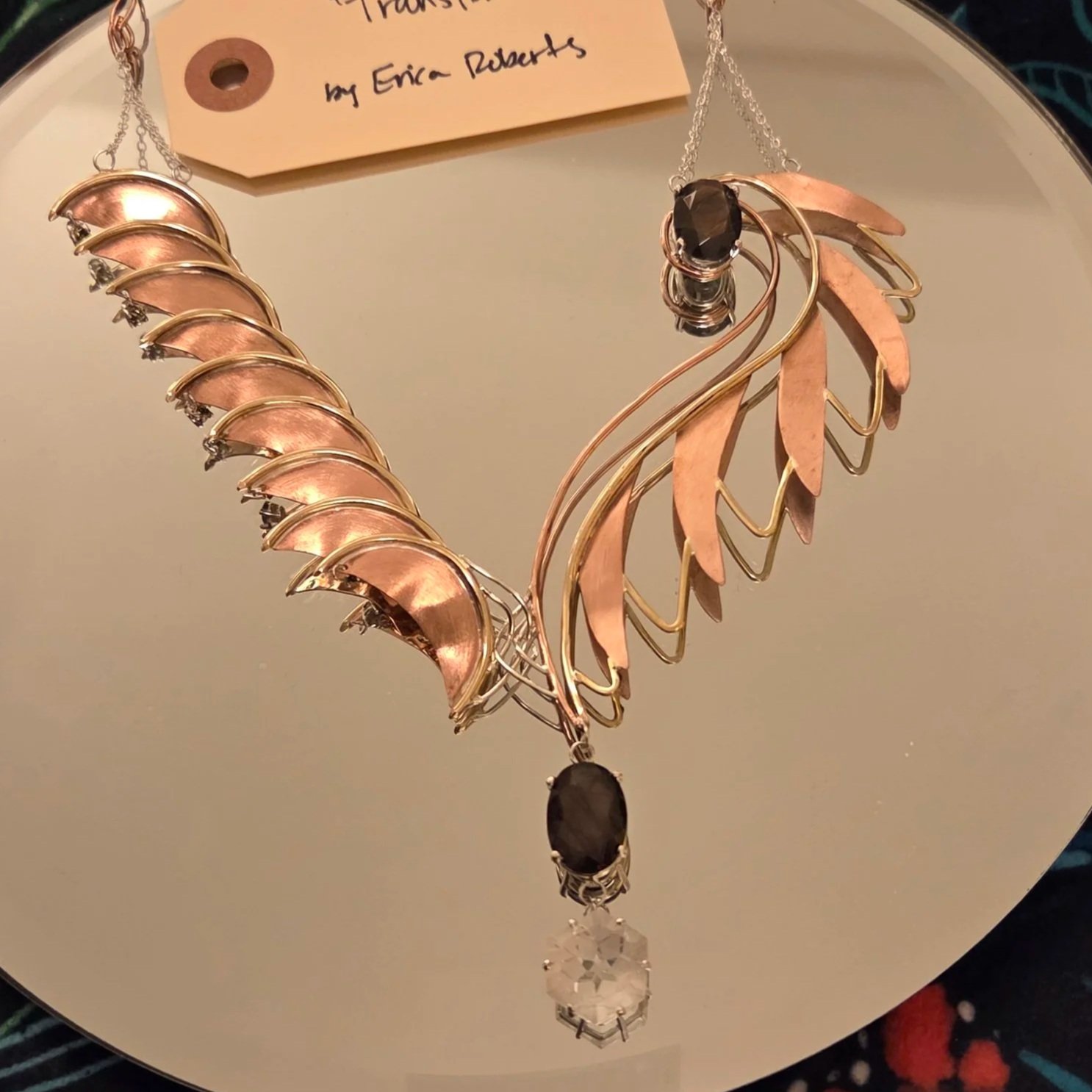 Erica Roberts with her“Transform” Neck Piece Inspired by the Legendary Phoenix! Erica came on strong with a visually striking project containing many different design elements that really brought forth the essence of transformation. Her clean use of hinges, interesting connections and creative use of materials really blew us out of the water. Well done!