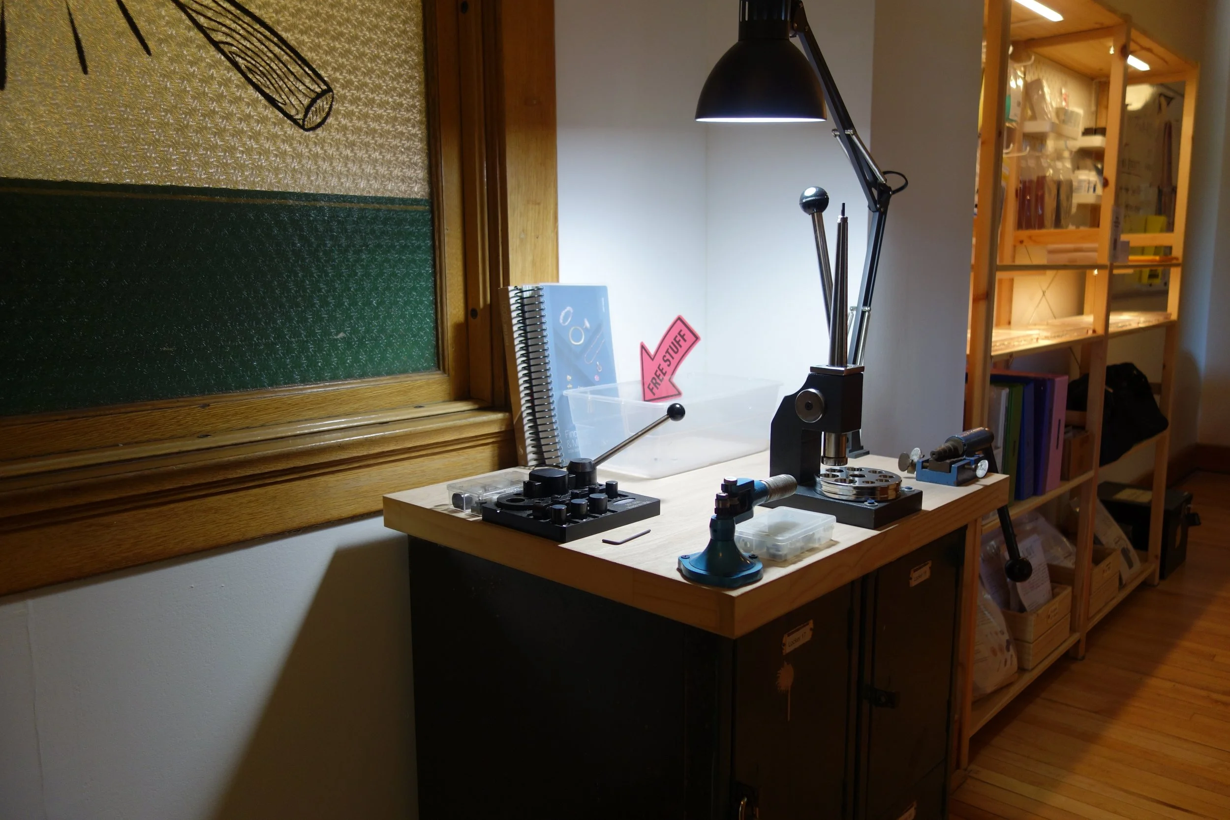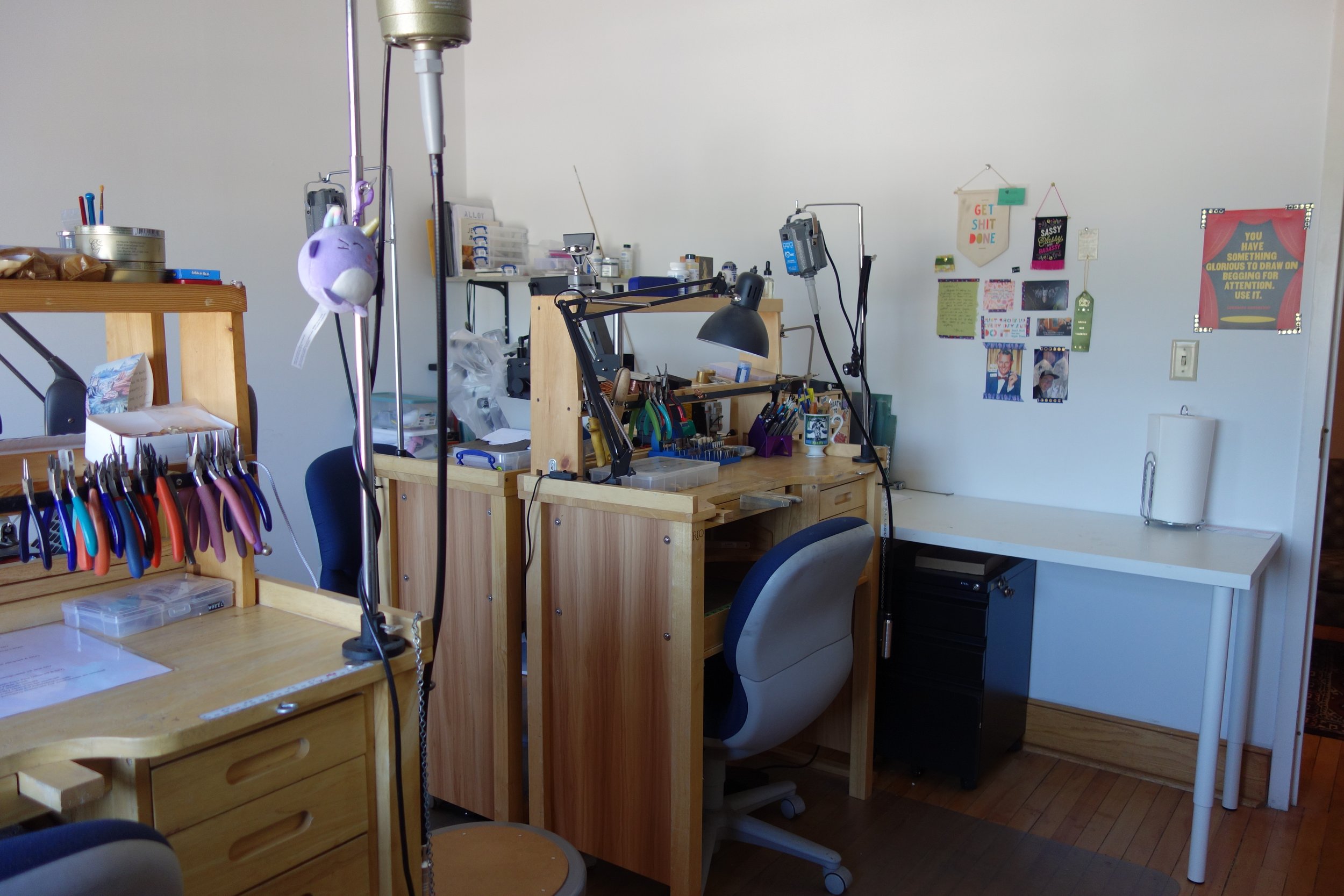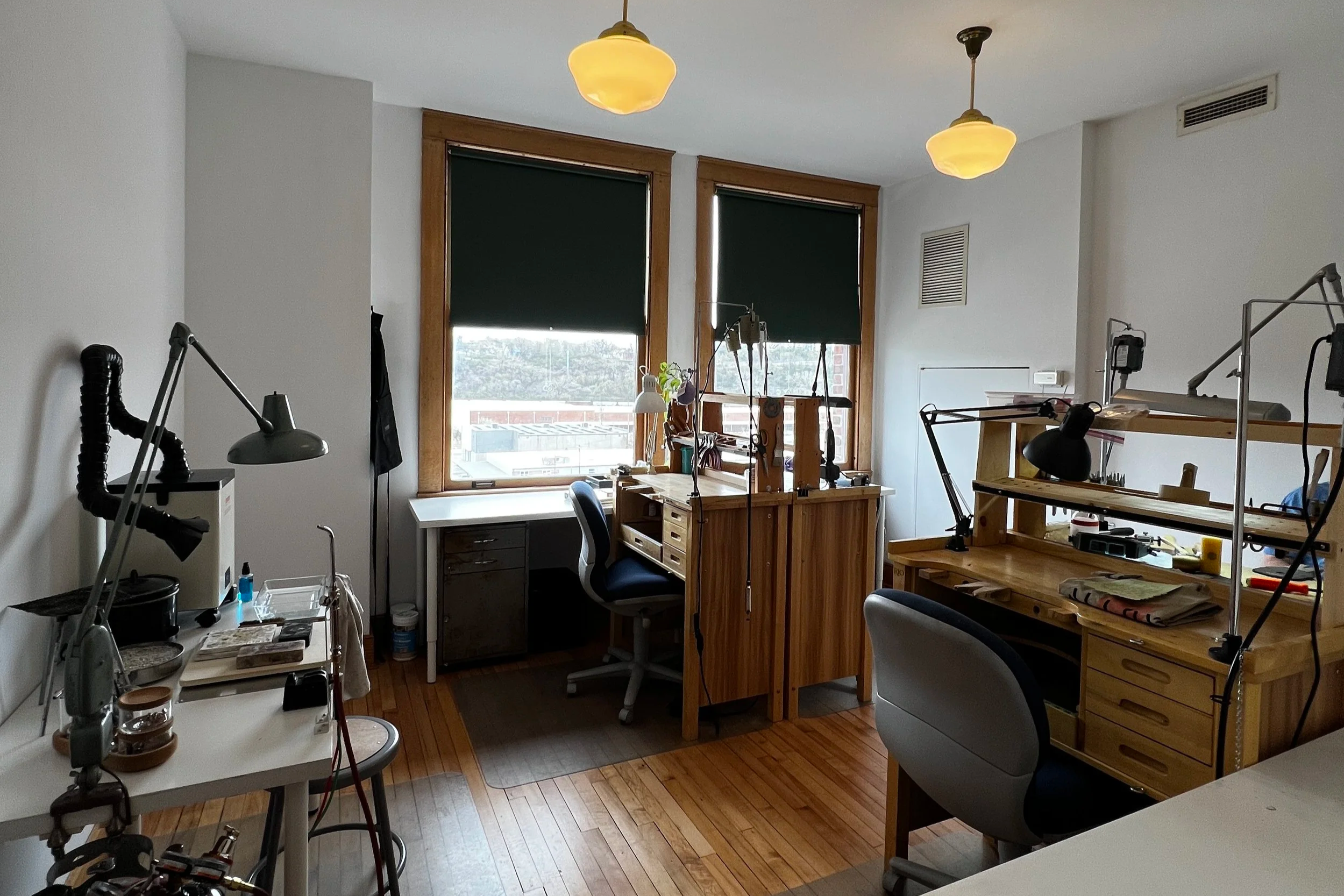The Designated Studios - A space exclusively dedicated to co-working, but for the metalsmith that wants to spread out a bit and keep their own bench. Between both Jasper and Agate studios, each space is equipped with 4 professional jeweler’s benches, each with their own flex shaft, adjustable desk chair, extra tool storage, design table, & locking cabinet.