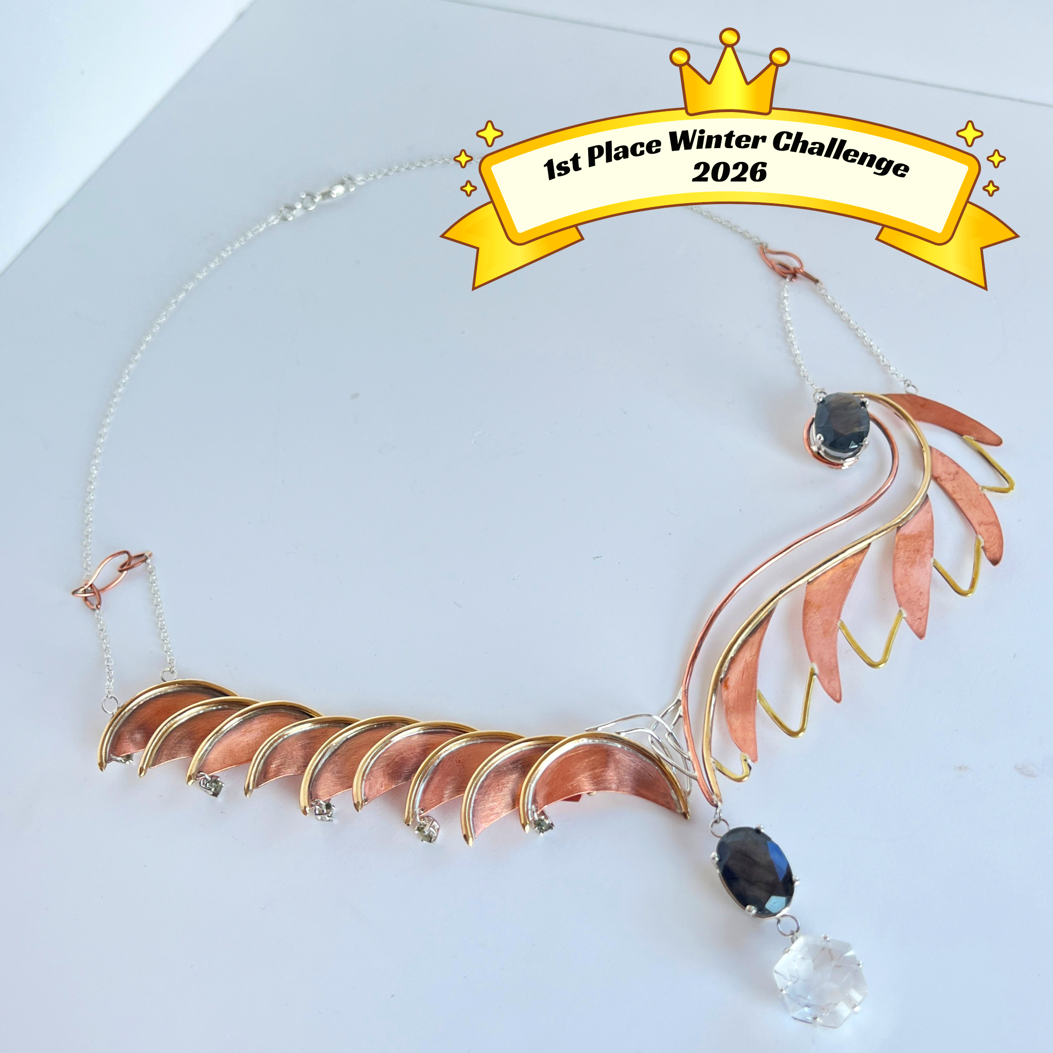 βTransformβ Neck piece featuring copper, brass, silver, and a variety of faceted stones.