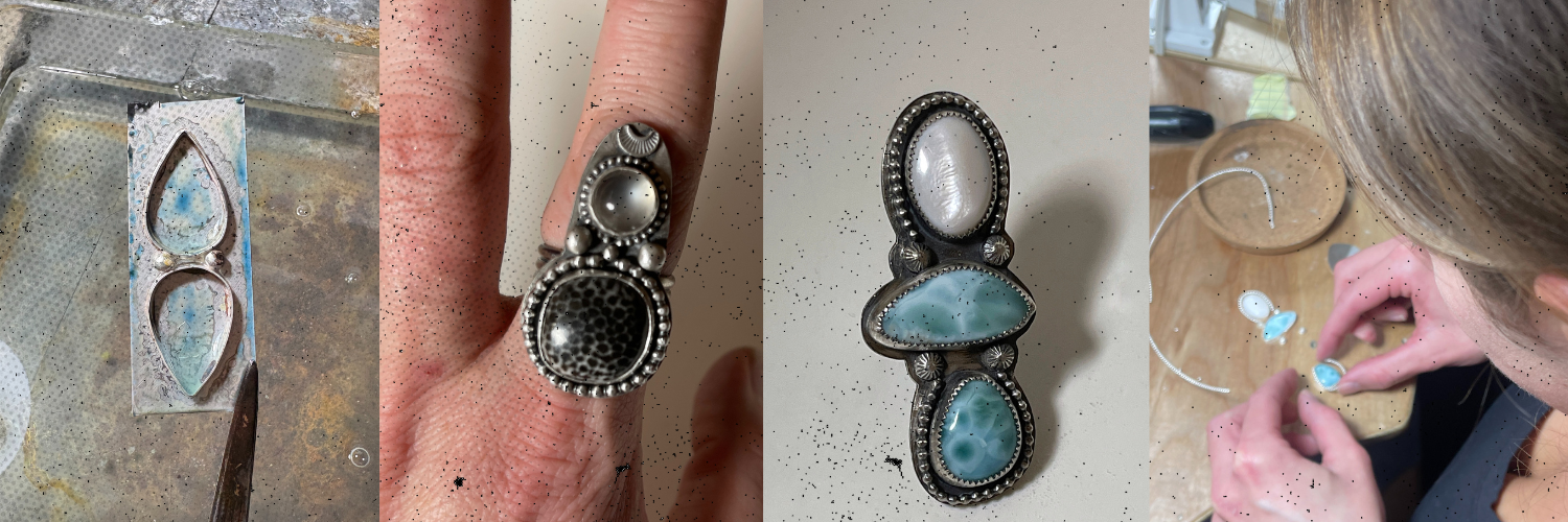 Ring sizing, ring forming, soldering, bezel creation, bezel setting, filling, sanding, and patina