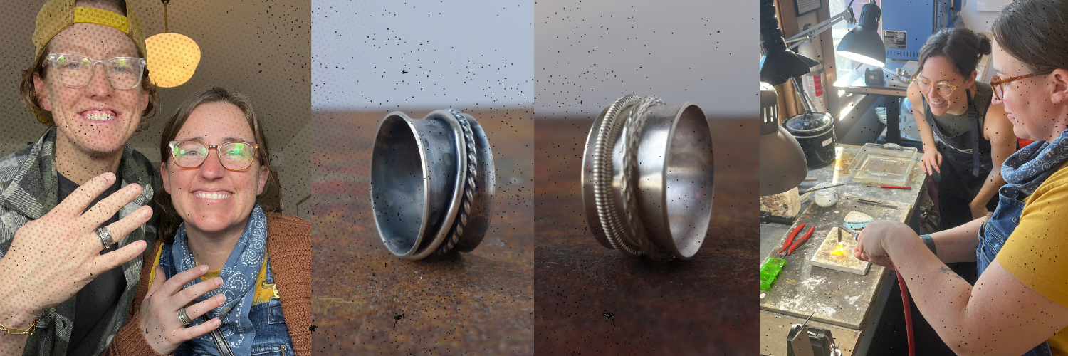In this hands-on class, you’ll start by creating the main ring: a wide 1/2" band that you can leave smooth or customize with texture. Once you've personalized your band, you'll cut it to size, shape it into a ring, and solder it closed. Then comes the magic—adding your spinners! You’ll choose two spinner bands and learn how to size them so they spin freely once your main ring is flared. The options are endless. See examples in the GALLERY below.